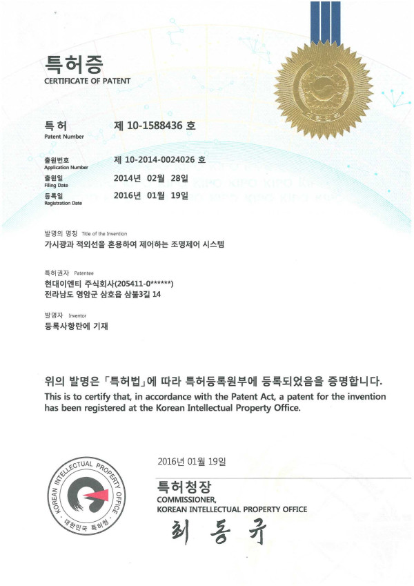 가시광선과 적외선을 혼용하여 제어하는 조명제어 시스템 특허 > 산업재산권현황