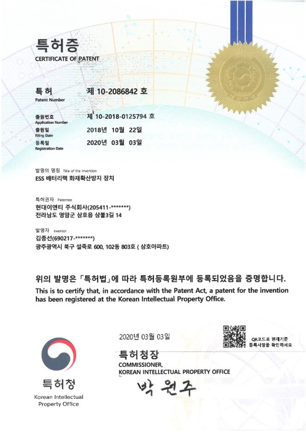 특허 ESS 배터리랙 화재확산방지 장치 특허